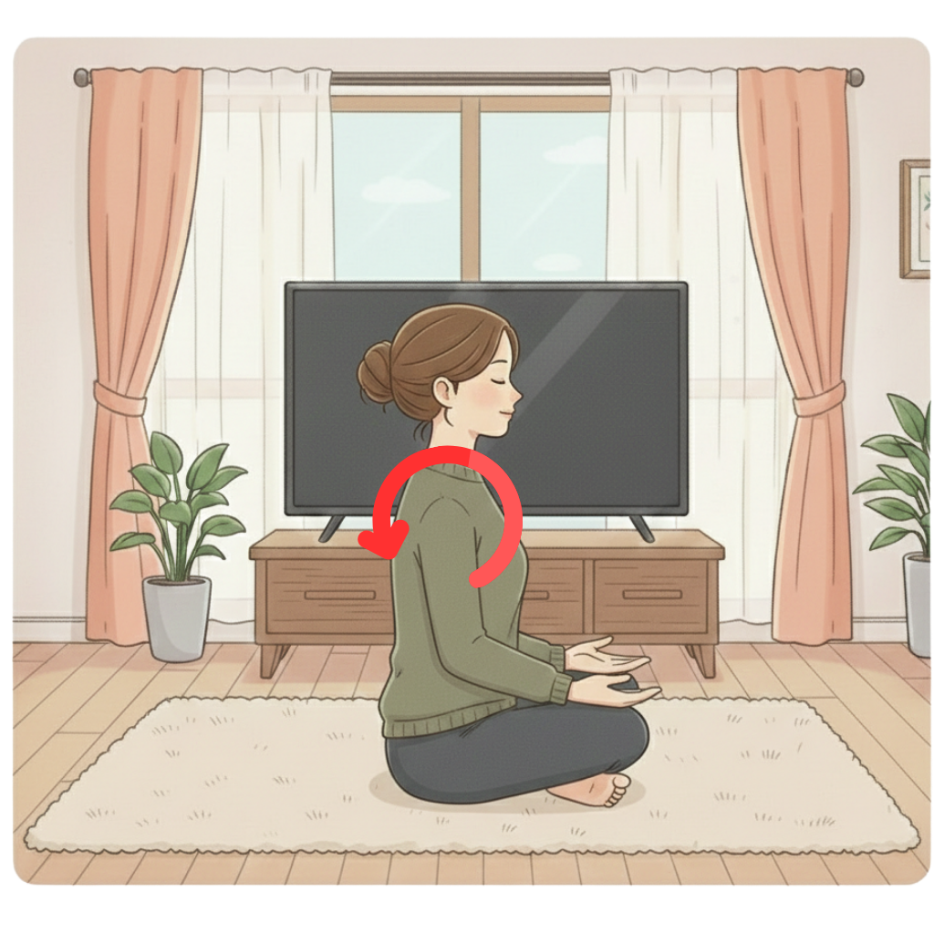 1. 座ってテレビを見ながら、あごをグーッと水平に後ろへ引きます。